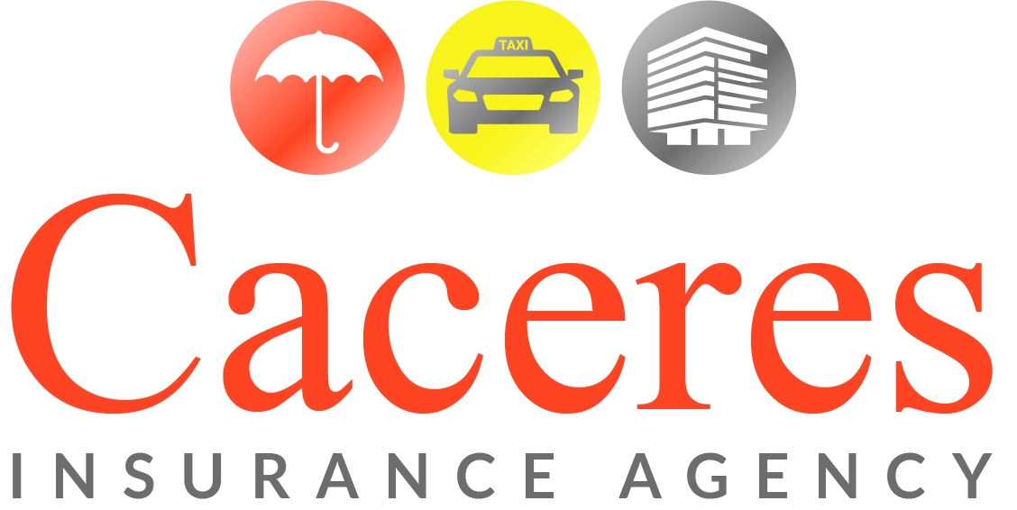 Caceres Insurance Agency sign on a gray wall; office interior with a plant and desk is visible.